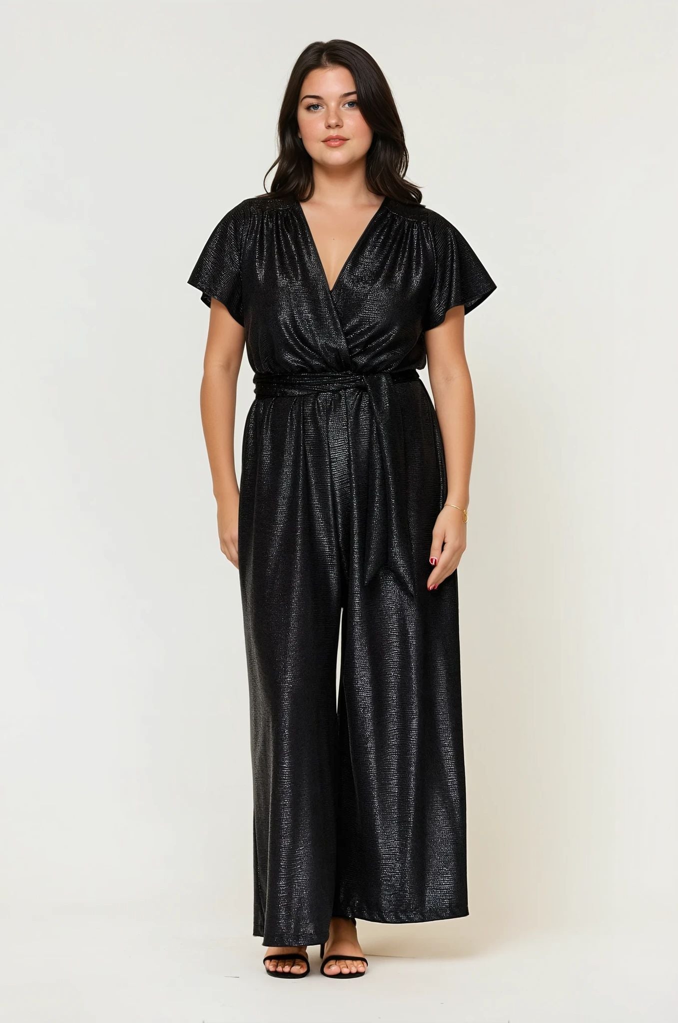 The unlined easy care no crease jumpsuit with deep V neck design can be worn with or without a wrap belt and designed to fall like a dress.