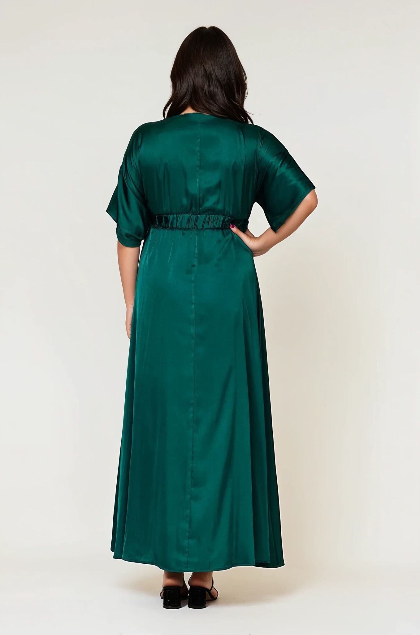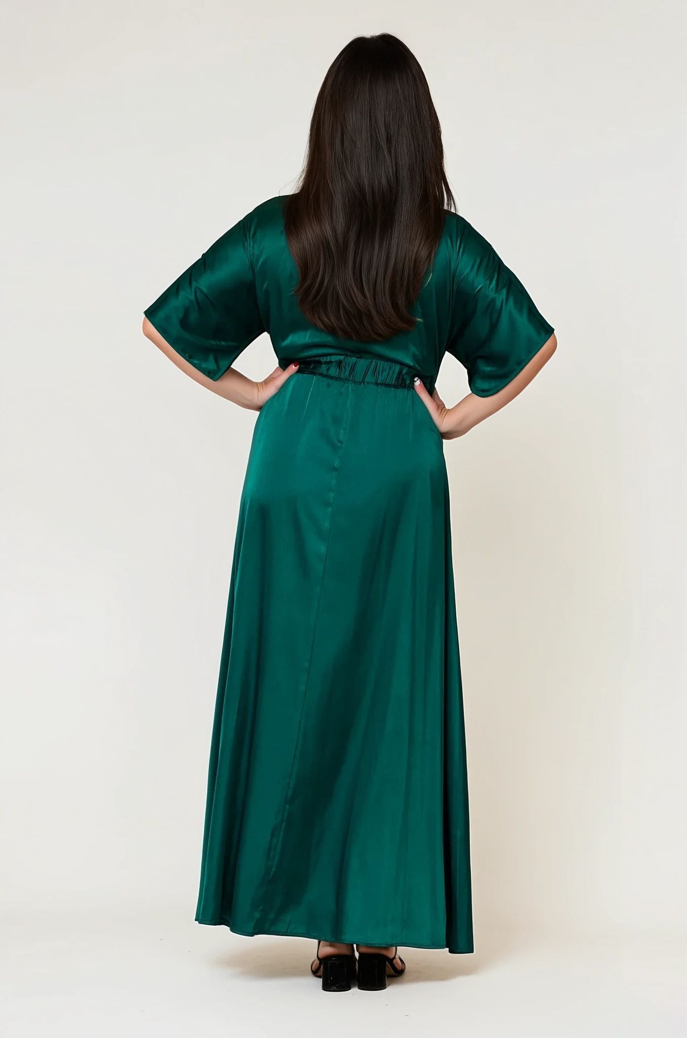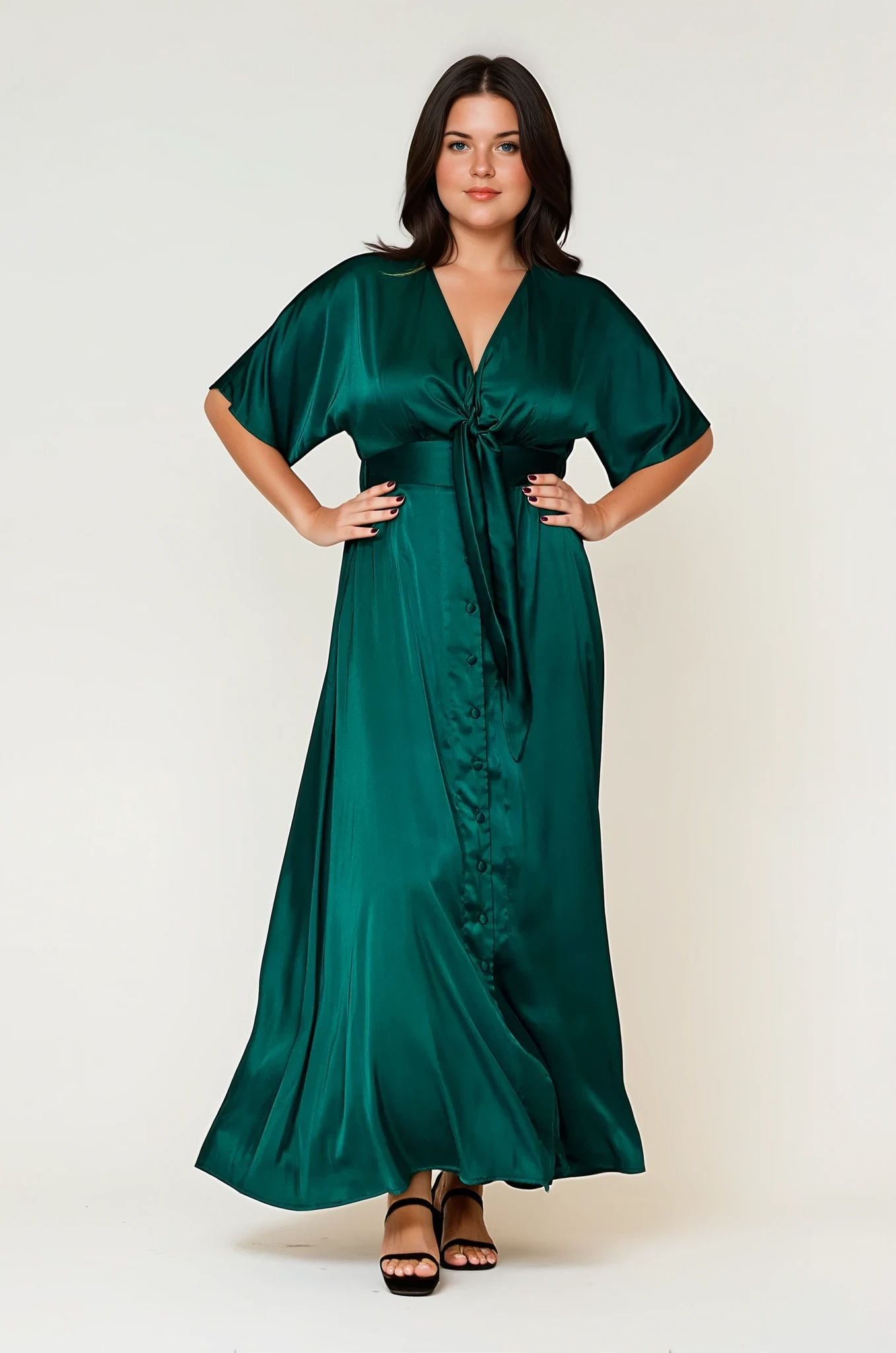 This glamorous long maxi style dress is suitable for day or evening wear. It is made with a generous amount of fabric in an Emerald green button-down front and tie bust. Designed to fall from your rib cage, the slimming design allows comfort around the waist area and suits all body shapes. The Kimono short sleeve adds to the elegance of the dress.