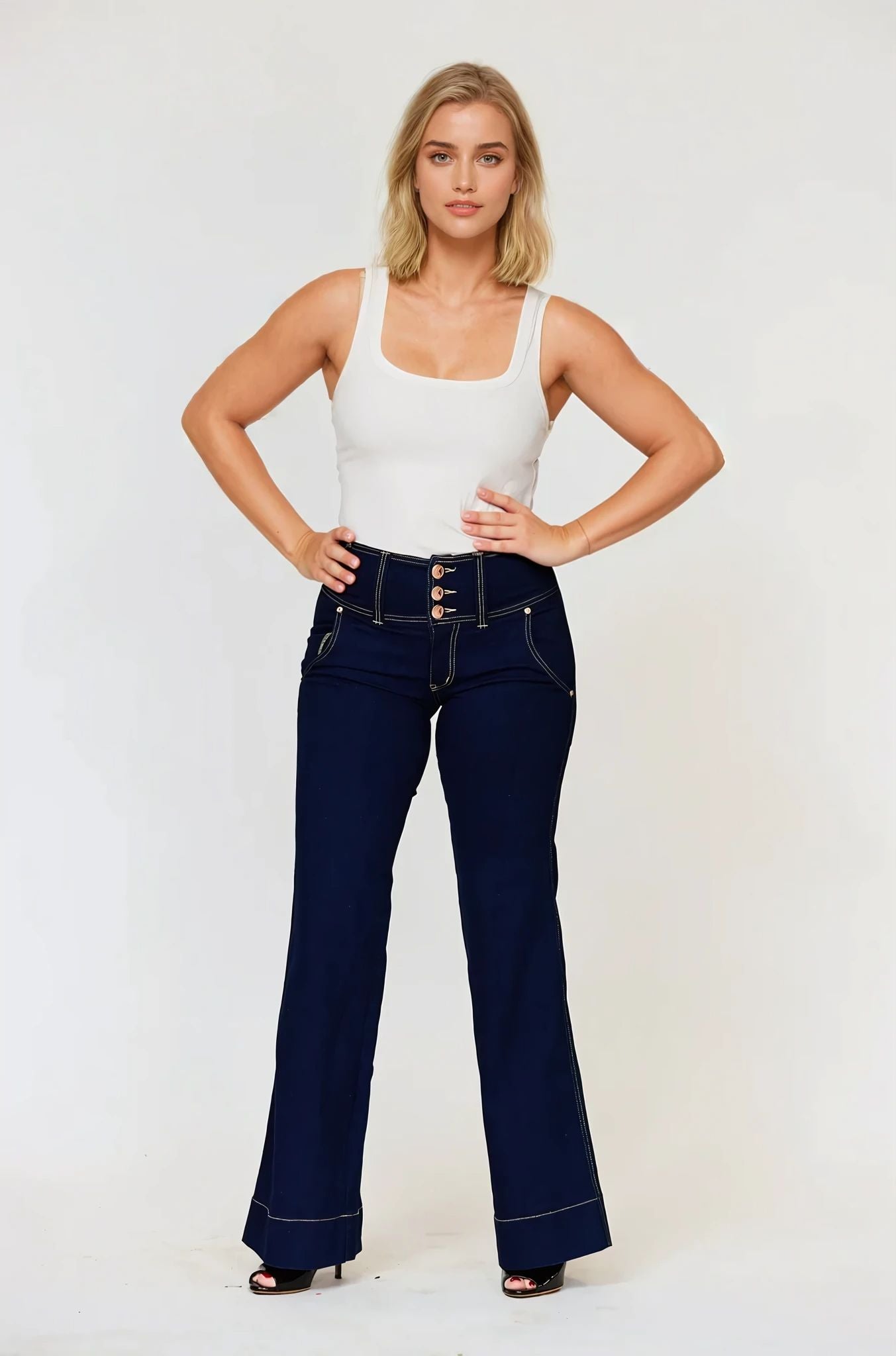 The perfect jean if you wish to create a waist or wish to accentuate your feminine figure. With a vintage-inspired wide trouser leg design that helps elongate your legs to appear longer. Bella looks super chic with your favourite boots or boho blouse, tuck in your shirt to show off the beautiful 3 button waist feature.