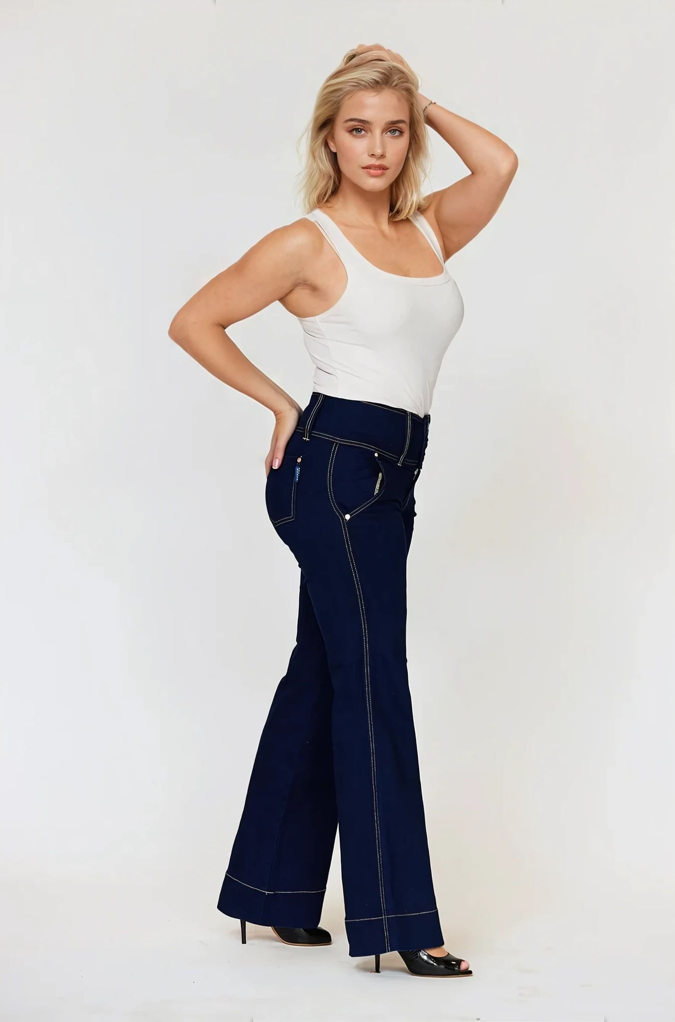 The Embody Women Bella Flare Jean is designed with special body shaping features, such as a flattering high-rise waist with a corset design that offers support for the tummy.