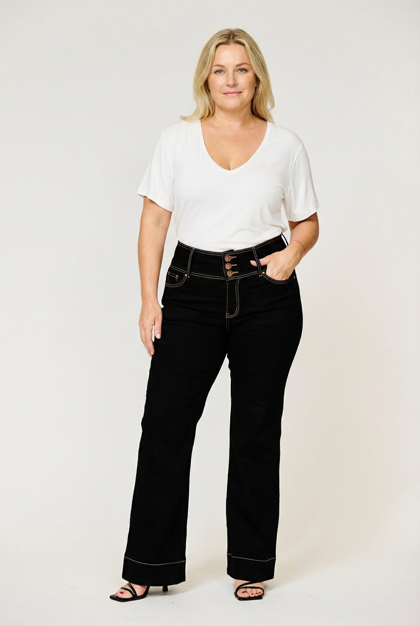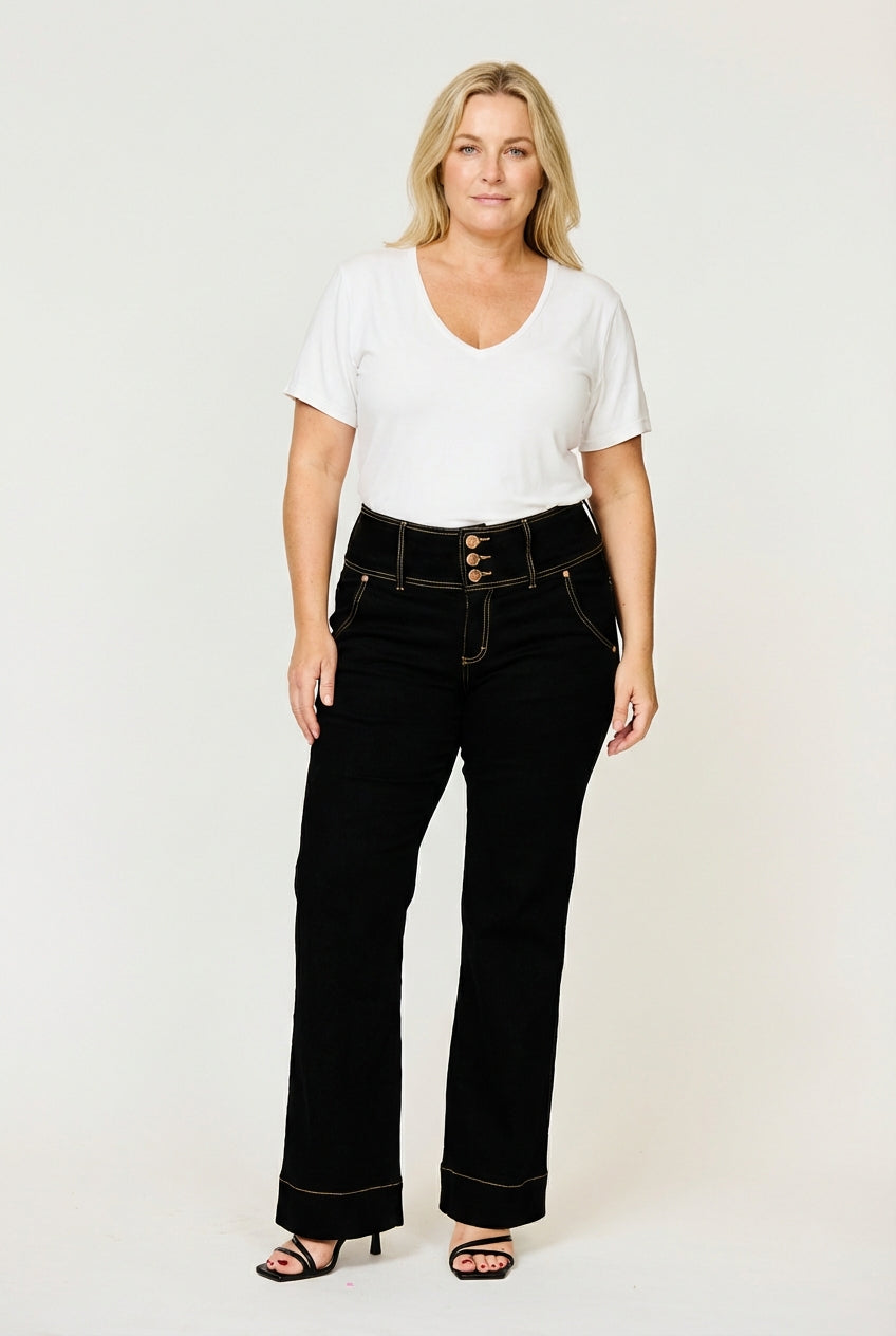 The perfect jean if you wish to create a waist or wish to accentuate your feminine figure. With a vintage-inspired wide trouser leg design that helps elongate your legs to appear longer. Bella looks super chic with your favourite boots or boho blouse, tuck in your shirt to show off the beautiful 3 button waist feature.
