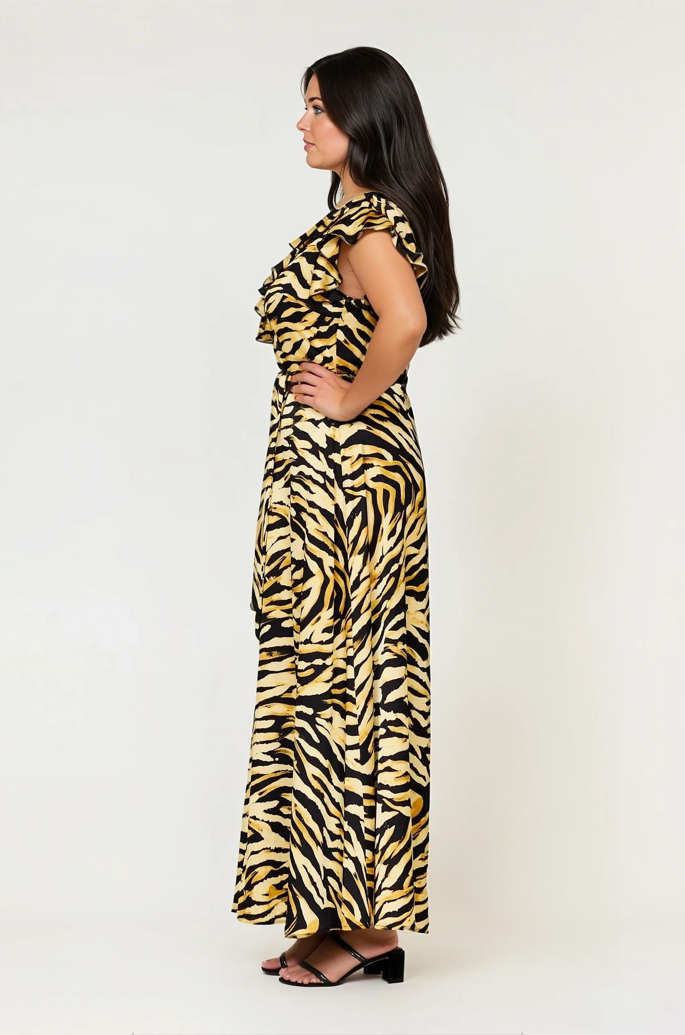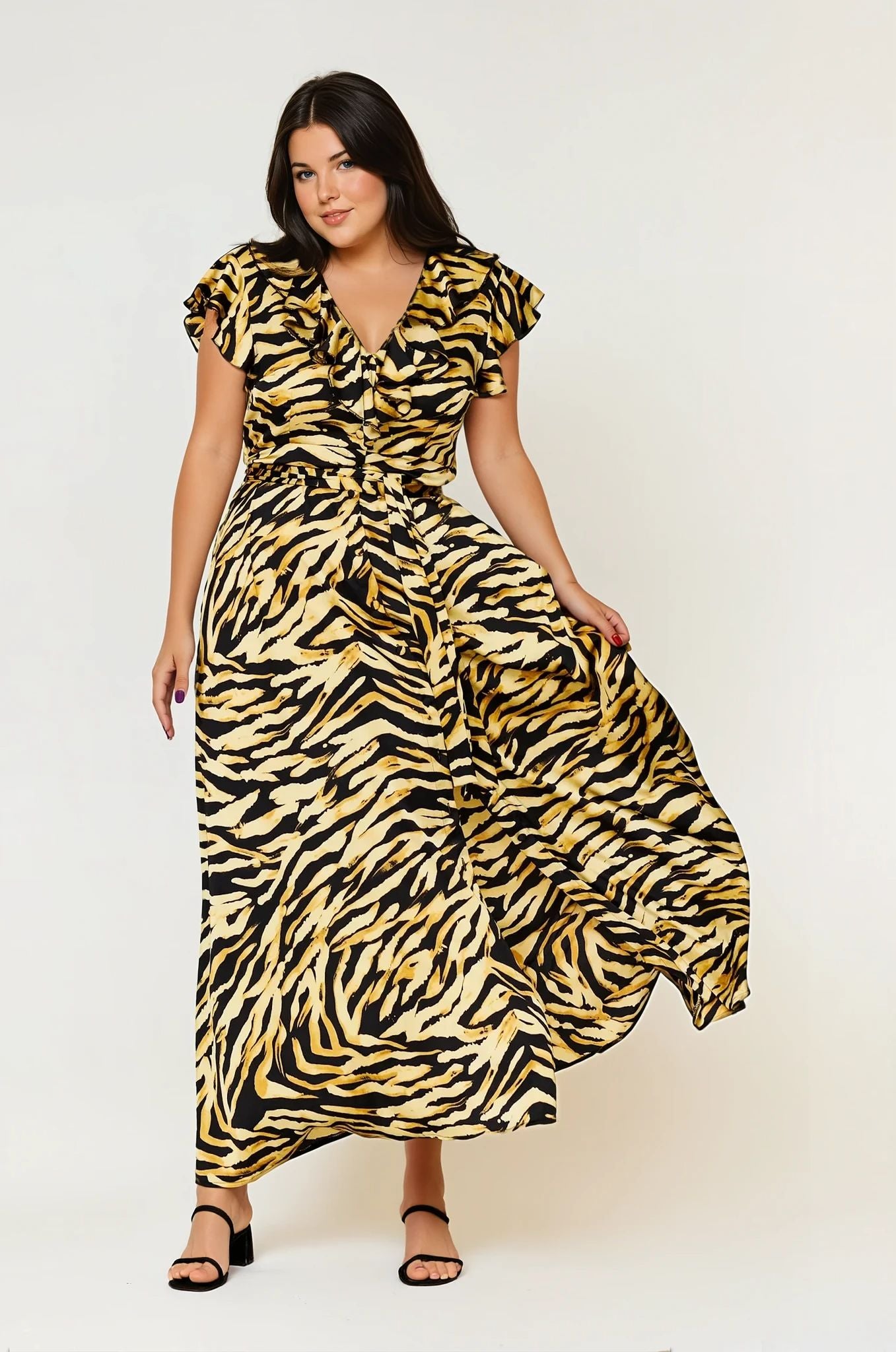 The vintage-inspired Birkin Dress by Embody Women perfectly combines elegant detailing around the silk touch fabric. Flounce frills to the neckline and sleeves add a feminine touch to the maxi-length dress whilst the Tiger print is a classic sophisticated feel. Finished with a self-tie belt to the waist, you can tailor the fit to your liking.