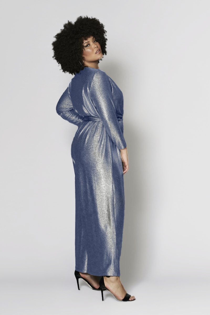 We find this style to be generous, we suggest choosing the next size down. Features include a slim bodice, wide leg, lightweight fabrication, minimal stretch, and unlined, opaque navy base with silver sapphire sheen. It also has a deep V-neckline with an open design that can be worn with a camisole or statement bra, long sleeve, and dart at bust. The tie up belt adds a unique touch.