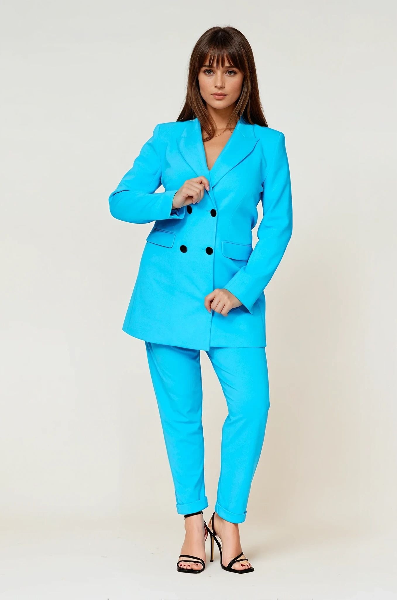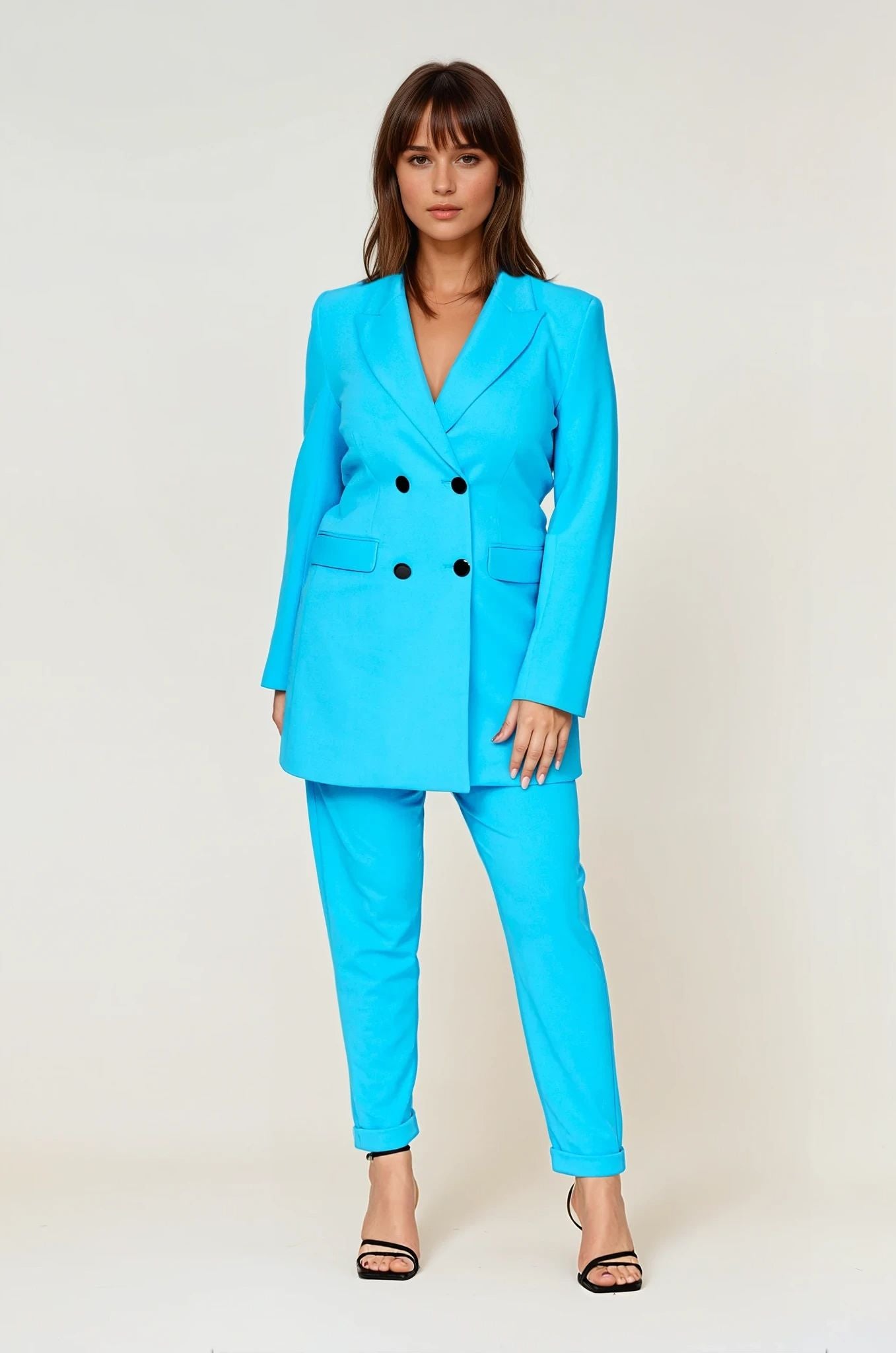 Introducing the Sarah Blazer Scuba Blue from Embody Women. This stylish blazer is perfect for any occasion. Crafted from a lightweight scuba fabric, it features a classic lapel collar and two front pockets. The tailored fit and single-button closure create a flattering silhouette that will make you look and feel your best.